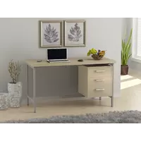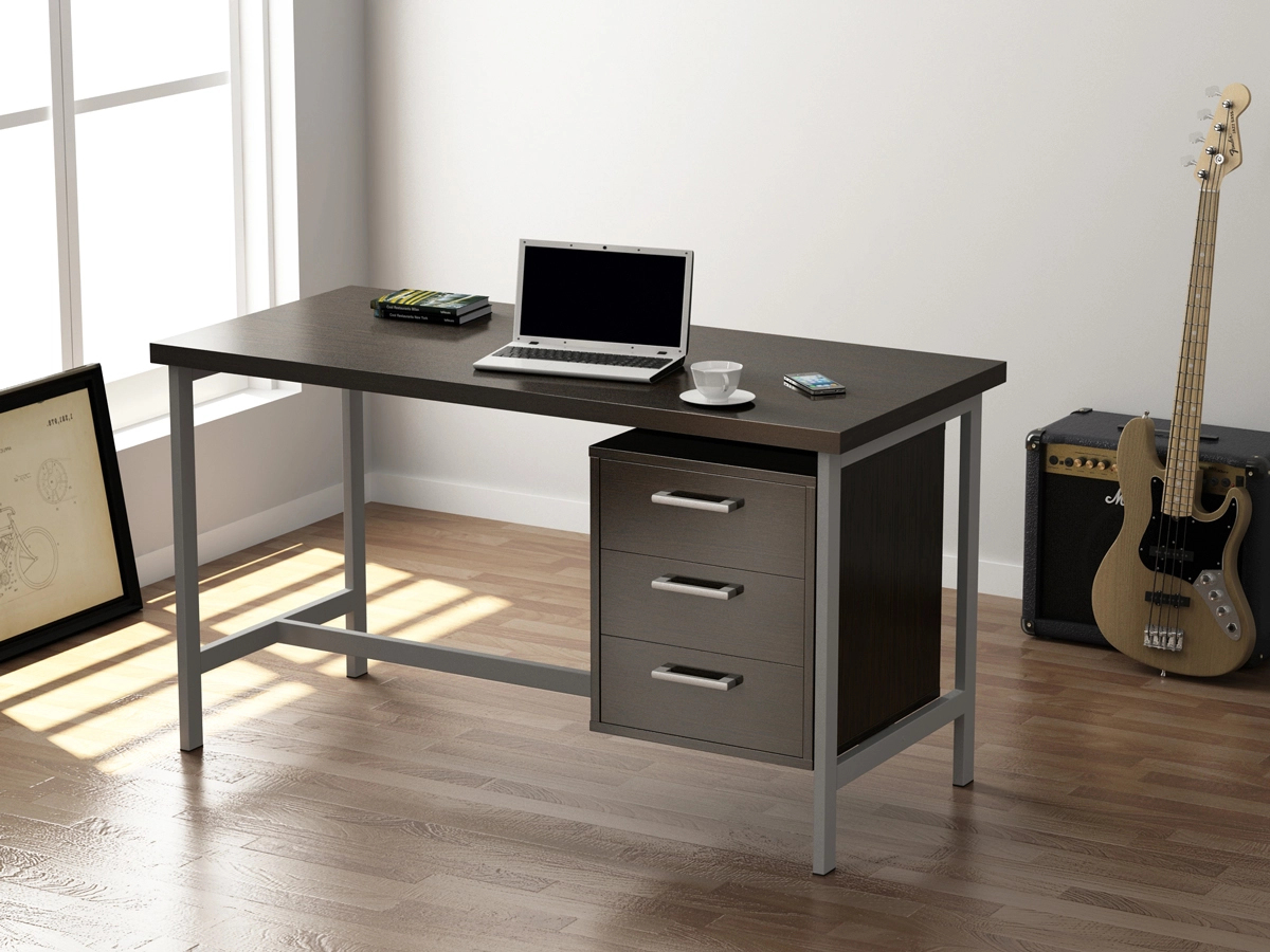 Металлическая конструкция произведена из прочной металлической трубы профилем 40*20 мм. Толщина металла 1,4 мм. Конструкция невероятно прочная и, следовательно, долговечная. Каркас письменного стола L-45 покрашен серебристой краской под хром. Для большей устойчивости письменного стола, в дополнение к прямоугольным ножкам используется еще три балки устойчивости: две под столешницей и одна под тумбой. Таким образом, столешница опирается на ножки и две балки, а тумба стоит на балке и крепится вверху к двум другим балкам сверху. Тумбу можно устанавливать как справа так и слева.